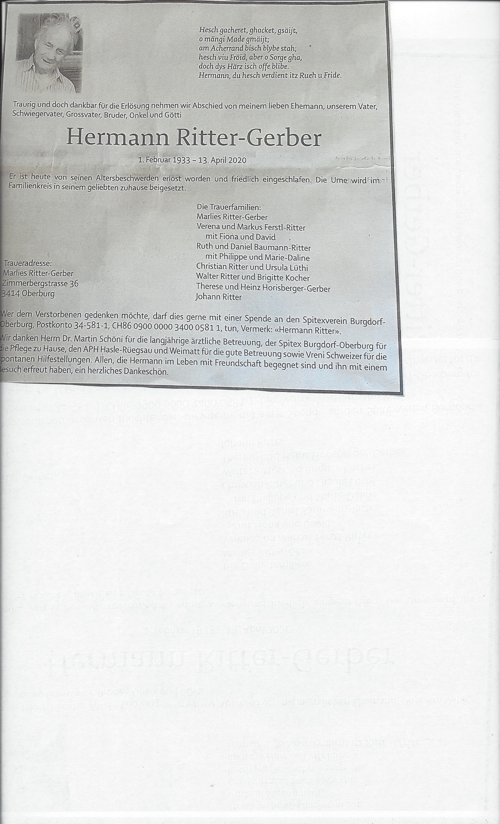 Todesanzeige Hermann Ritter - Gerber